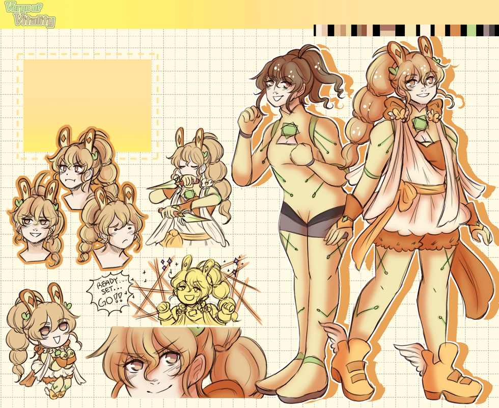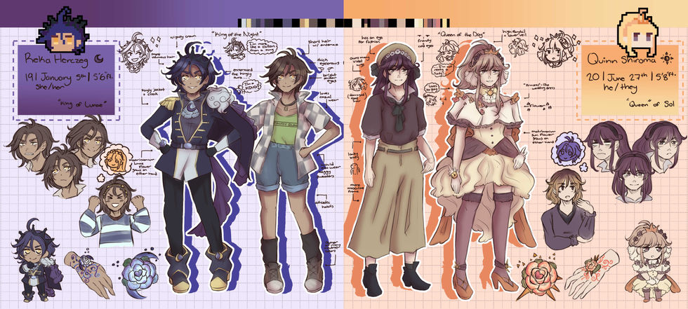Concept sheets and model sheets for fantasy, sci-fi, magical girls showing different outfits, facial expressions, and other notes.